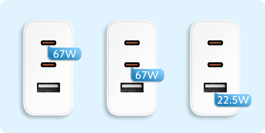 Type-C1 + Type-C25V⎓3A 9V⎓3A 11V⎓3A 12V⎓3A 15V⎓2A 20V⎓2.25A5 V ⎓ 2,4 A 9 V ⎓ 2 A 12 V ⎓ 1,5 AIl alloue la puissance en fonction des besoins en énergie et de l’ordre d’insertion des appareils.Type C1 + Type AType C15V⎓3A 9V⎓3A 11V⎓3A 12V⎓3A 15V⎓2A 20V⎓2.25AType A5 V ⎓ 2,4 A 9 V ⎓ 2 A 12 V ⎓ 1,5 AType-C2 + Type-A5V⎓3A MAX